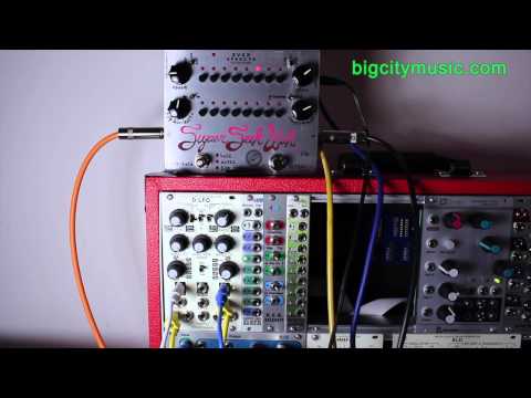 A Cwejman D-LFO sawtooth wave has been routed through the Super Seek Wah whose sequencer is clocked via MIDI from a computer. The Cwejman D-LFO module's pitch is tracked via MIDI to CV from a Vermona qMi.