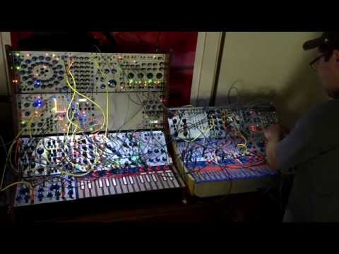 "First time interfacing the old super easel with 200e modules. I've never closely calibrated the 200's oscillators and discovered that it's scaled to 2.4V/octave. So it's not exactly compatible with the 1.2v/oct of the 200e system."