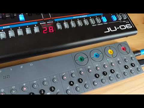 "I haven't worked out how to manually change this in the OP-Z settings yet, but I did work out that when OP-Z is on midi channel 1 - pattern 1 sends program change to JU-06 patch 11 (first patch). Pattern 9 changes JU-06 to patch 21 (first patch in bank 2)"