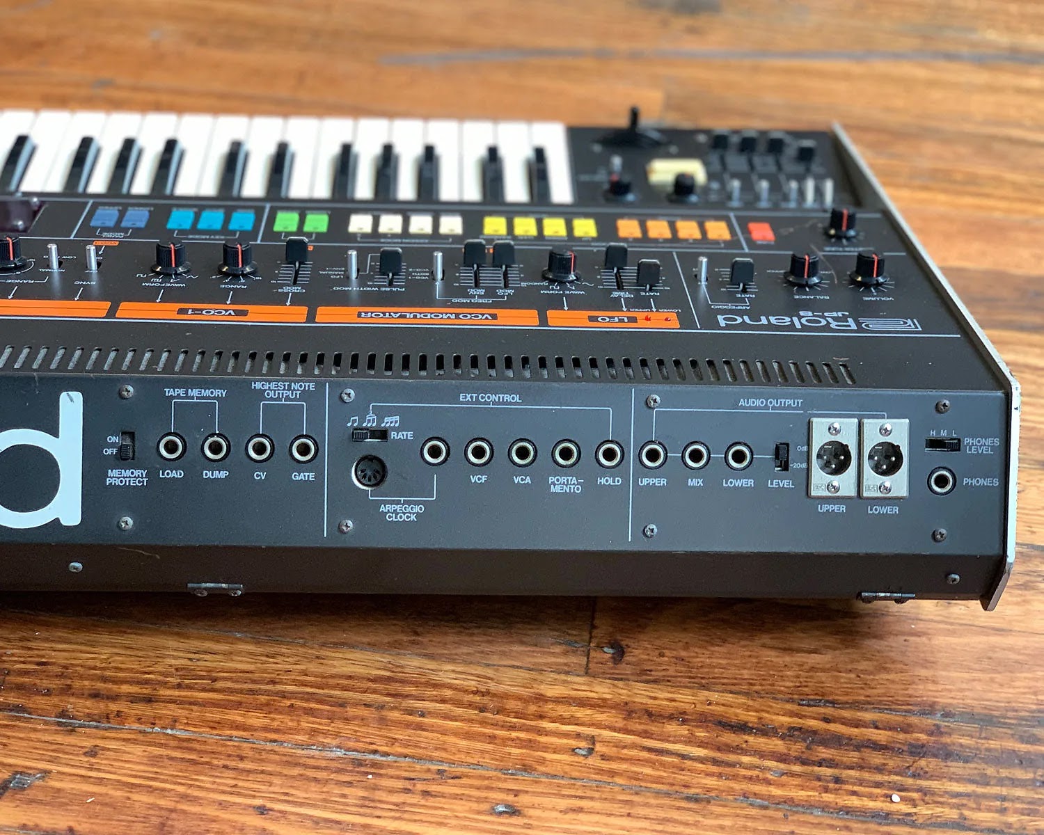 "The Titan of polyphonic analogue synthesisers. The Jupiter 8 is the golden child of Roland's legacy in professional electronic instruments, featuring 16 analogue oscillators at 2 per voice, eight voice polyphony, split-able 61 key keyboard, 2-pole (12 dB/oct) or 4-pole (24 dB/oct) filter modes, and 64 patch presets that can store keyboard splits, arpeggiator settings, voice assign mode, hold, portamento and modulation settings. Made in Japan. MIDI Mod by Robin Whittle. Fully serviced prior to sale."