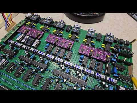 "This is a test of the latest version of my self contained 6 voice polysynth board. it has 6 dual DCOs with super saw, square with PWM and a triangle, a standard saw, square with PWM and a sub oscillator. These are fed into AS3372E analogue filters configured the same as the matrix 12 filters for 16 variations of LP, HP, BP, notch etc. Each voice has 3 ADSRs, 3 LFOs and a noise source."